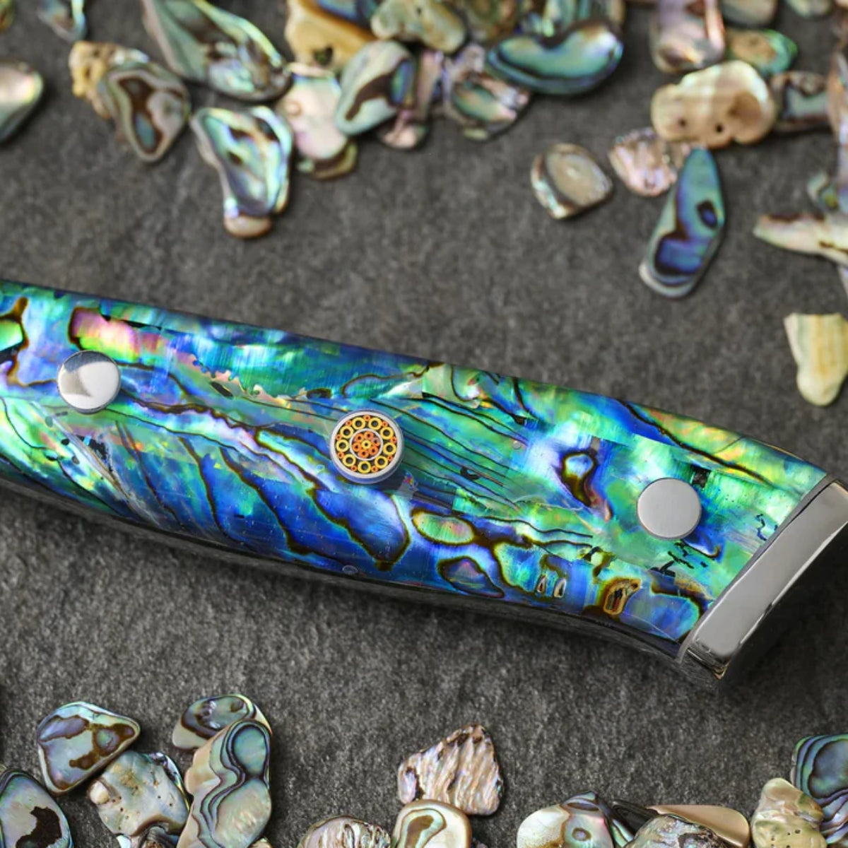 The SHINKAI COLLECTION by Lorvik brings the mysterious elegance of the ocean to your kitchen – with shimmering abalone shell handles and blades forged from premium Japanese Damascus steel.